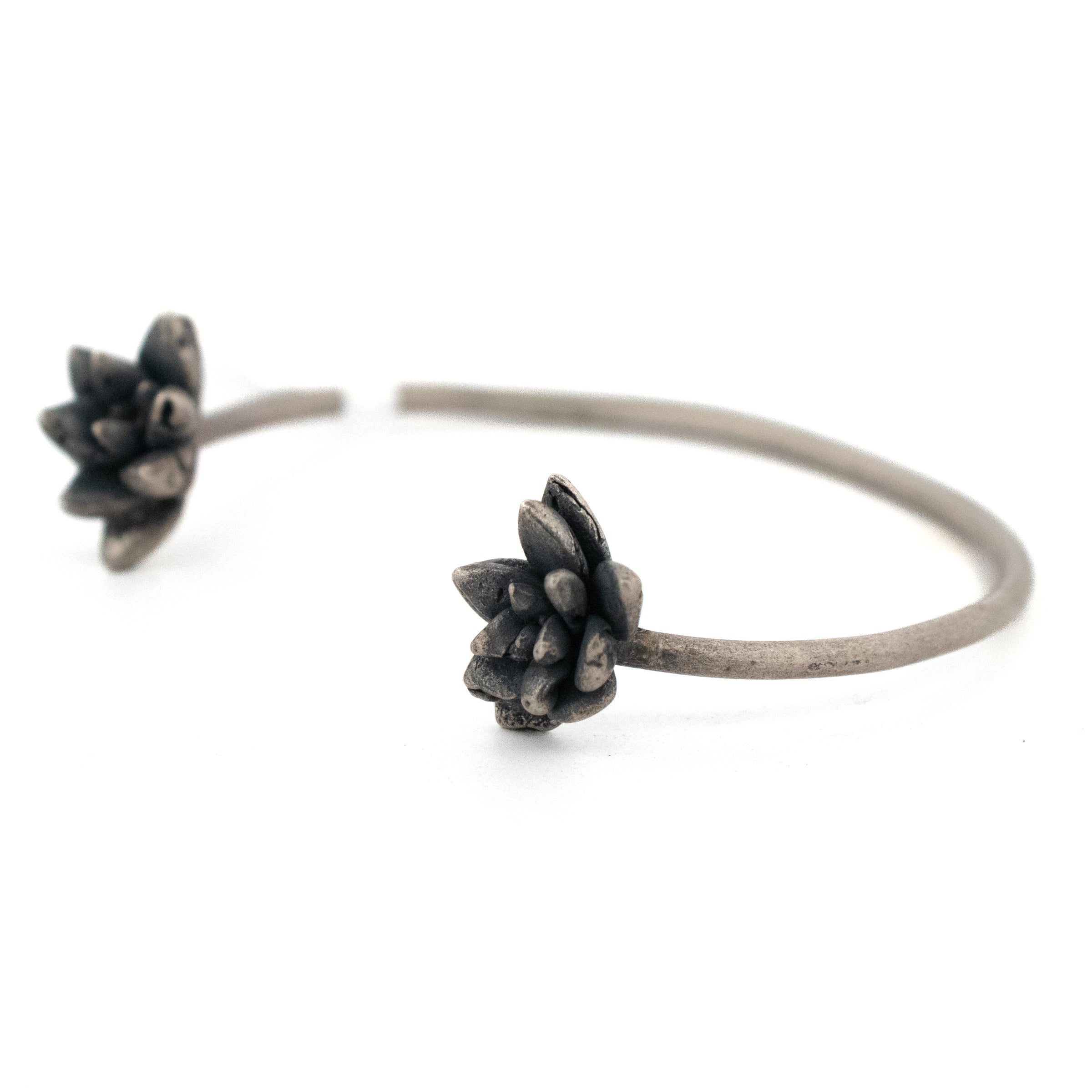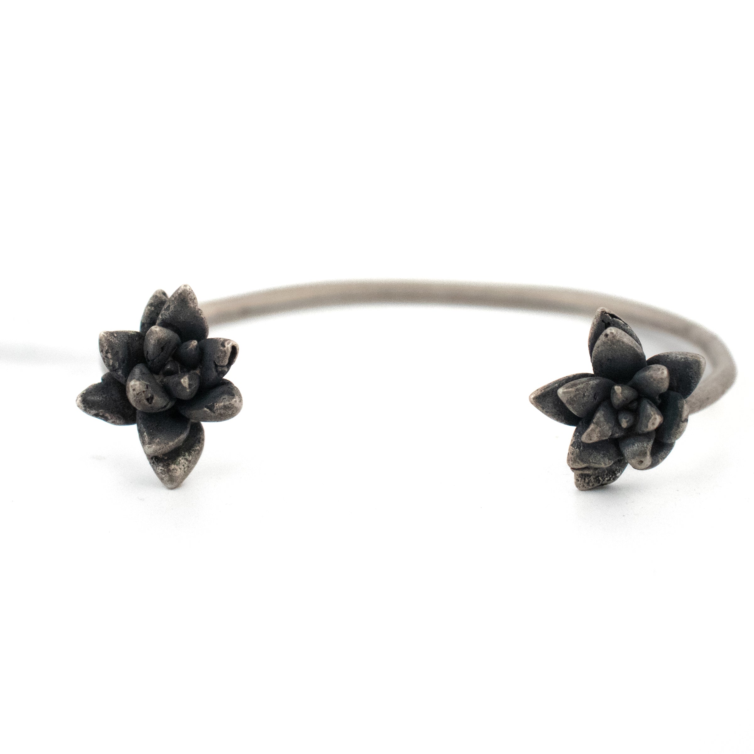 Focals for this elegant botanical bracelet are cast from x Sedeveria, a cross between sedum and echeveria succulents. Each succulent is grown & collected from my plant collection in my Detroit home.  In the summer months, succulents adorn my front porch, cascading out of their pots. In the winter I bring nature inside to live in my office windows. Each piece is cast in solid metal preserving unique dimension and texture from the source plant.