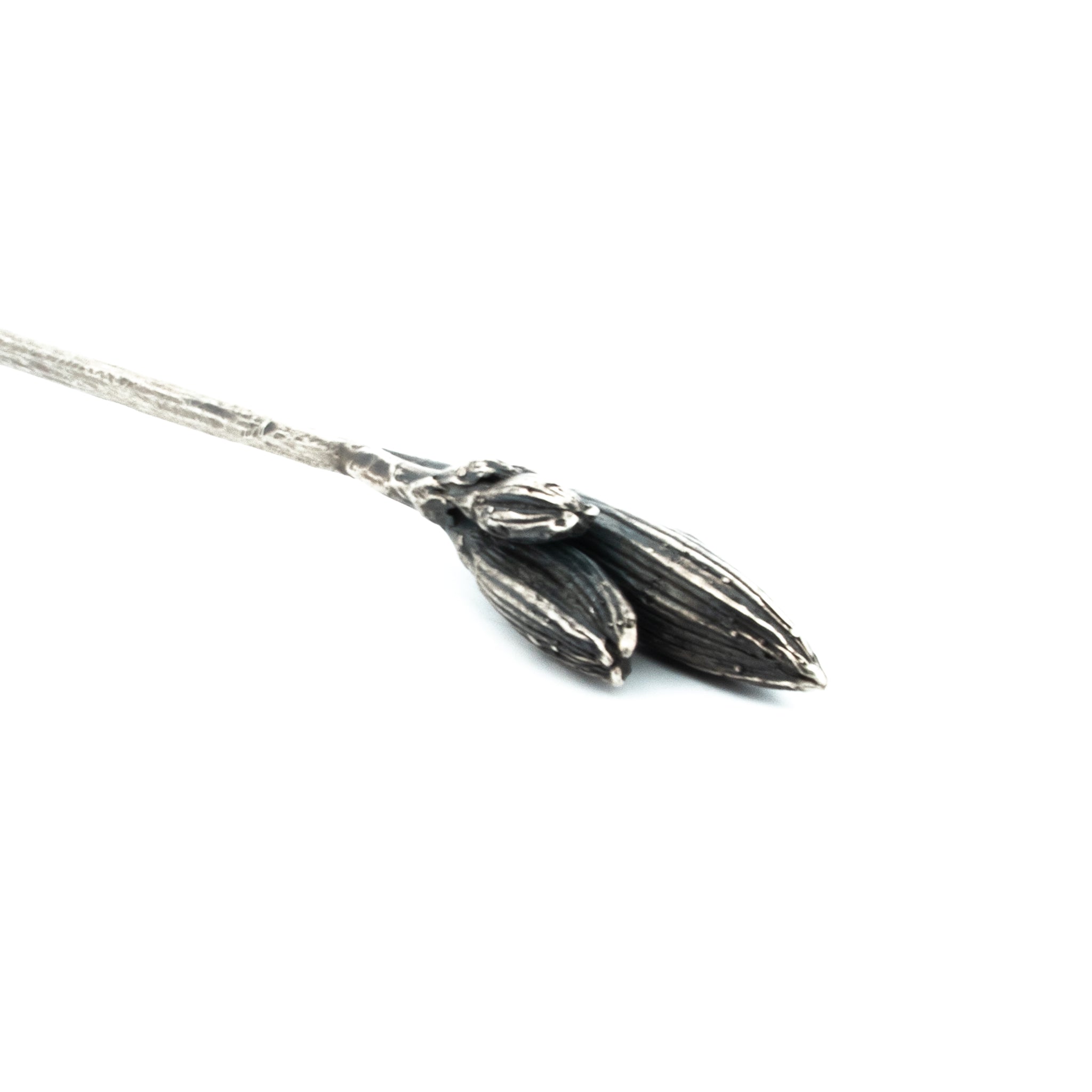 A midsummer day lily bud collected from the sidewalk gardens in Midtown Detroit, cast in sterling silver on a silver wire.