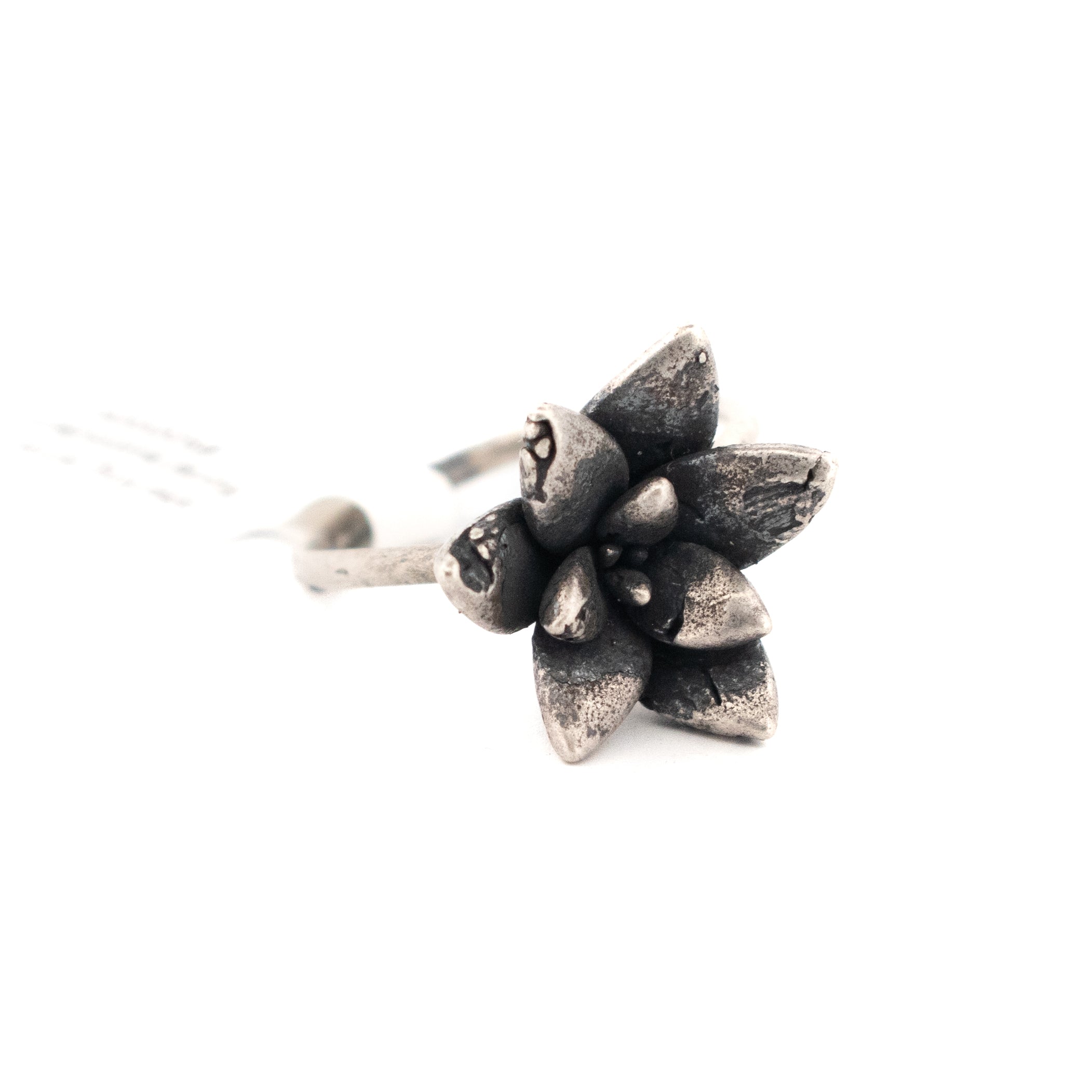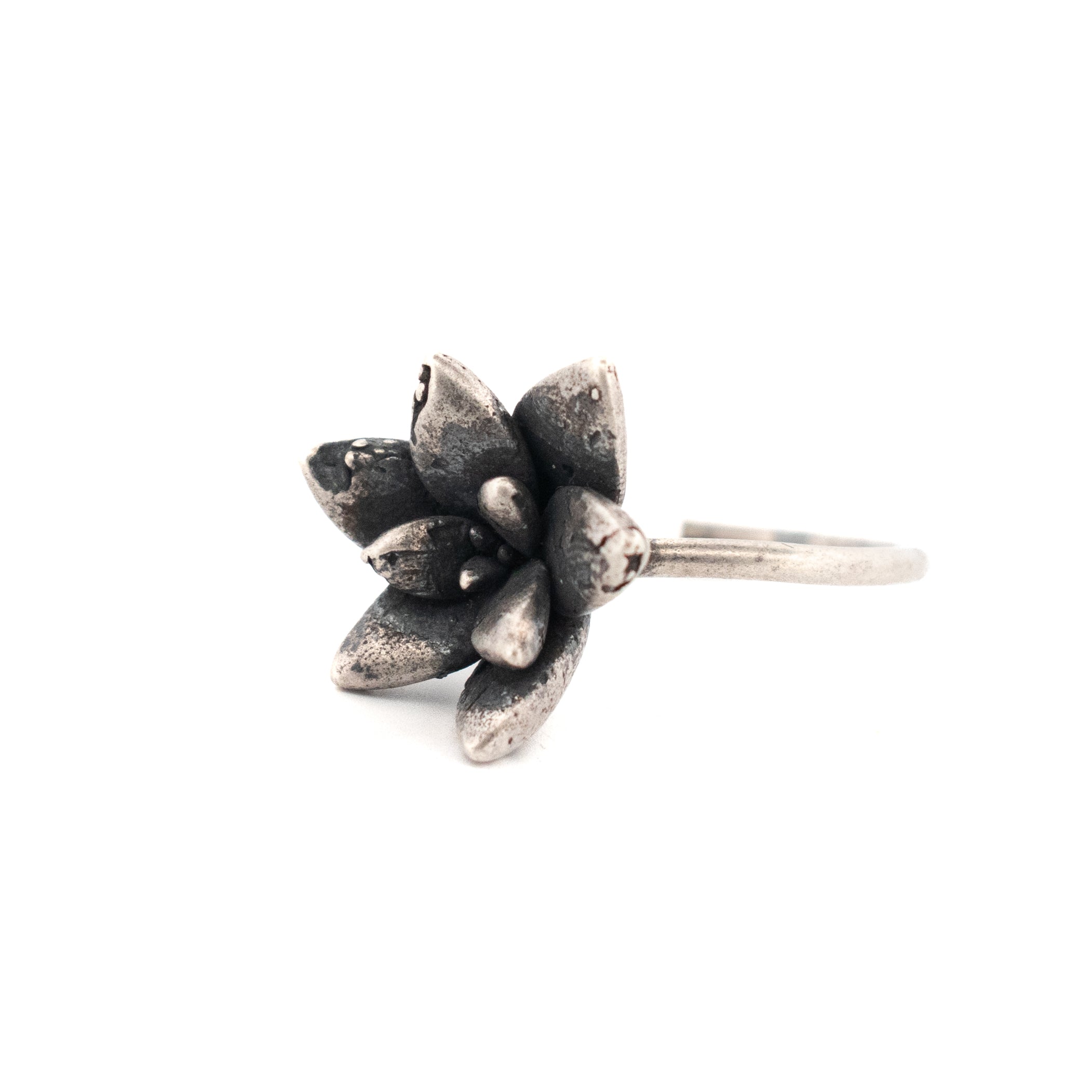 Show off the mesmerizing beauty of succulents with the floral succulent ring. The focal is cast from x Sedeveria, a cross between sedum and echeveria succulents. Each succulent is grown & collected from my plant collection in my Detroit home. In the summer months, succulents adorn my front porch, cascading out of their pots. In the winter I bring nature inside to live in my office windows. Each piece is cast in solid metal preserving unique dimension and texture from the source plant.