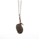 Wear nature around your neck with alder catkin cone necklaces. Alder catkins are actually petal-less flowers that spread seeds in the wind. Over time the catkin hardens and looks similar to a pine cone. The Alder tree symbolizes strength, protection, determination, and confidence. Each piece is cast in solid metal preserving unique dimension and texture from the source plant.