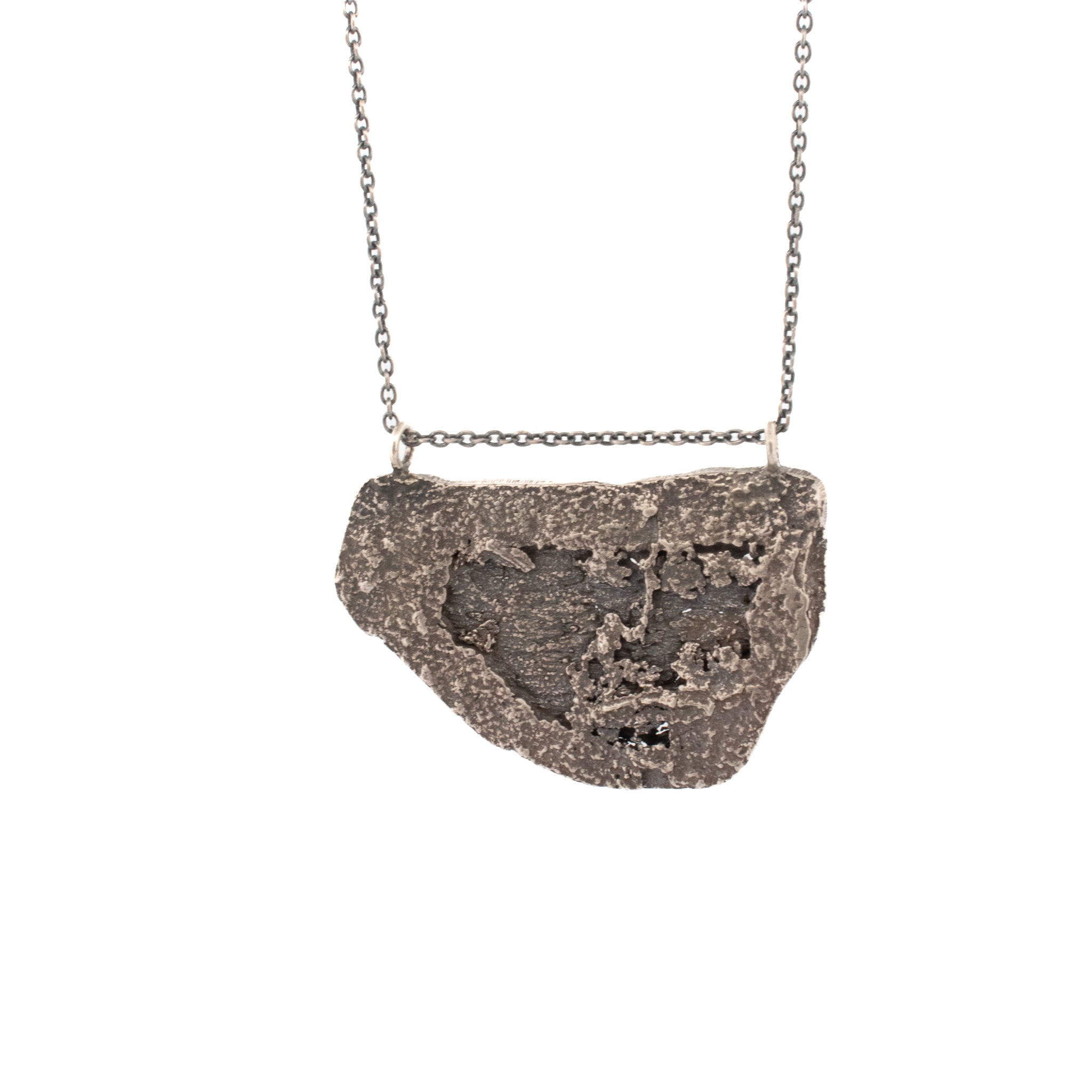 Sterling silver bark focal link on a silver chain. I collect bark from woodpiles and fallen trees on my adventures all across Michigan. Every piece is cast in solid metal preserving unique dimension and texture from the source bark. An antique finish emphasizes this texture.