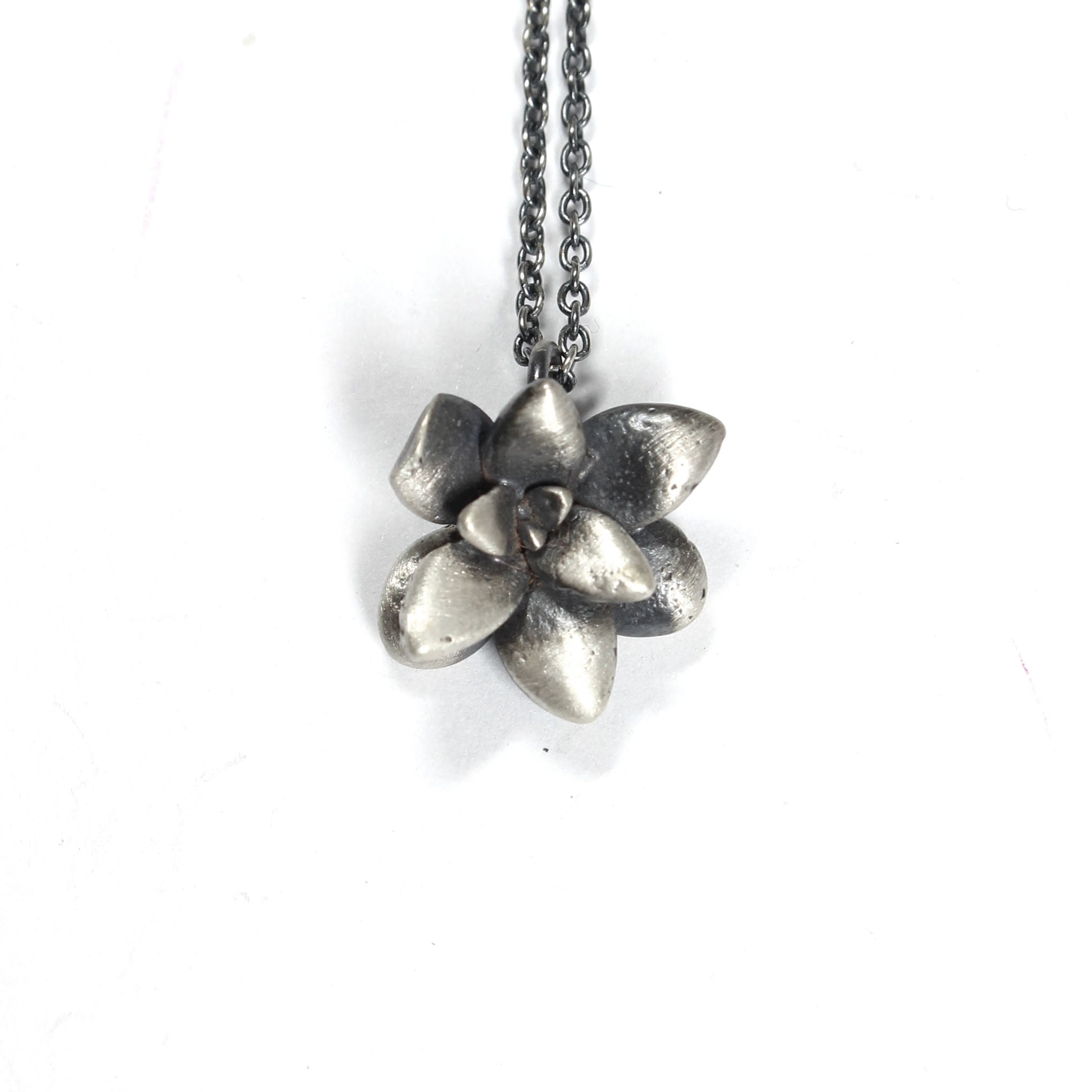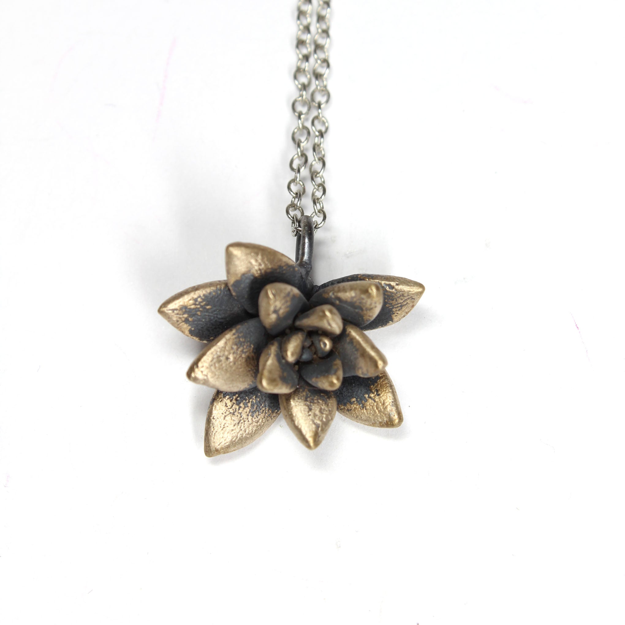 Whether layered & lovely or standing out on its own, the floral succulent necklace is an eye-catching treat. Focals are cast from x Sedeveria, a cross between sedum and echeveria succulents. Each succulent is grown & collected from my plant collection in my Detroit home. In the summer months, succulents adorn my front porch, cascading out of their pots. In the winter I bring nature inside to live in my office windows. Each piece is cast in solid metal preserving unique dimension and texture from the source plant. Please note: Each piece is one-of-a-kind by nature. Color and pattern may vary from images shown.