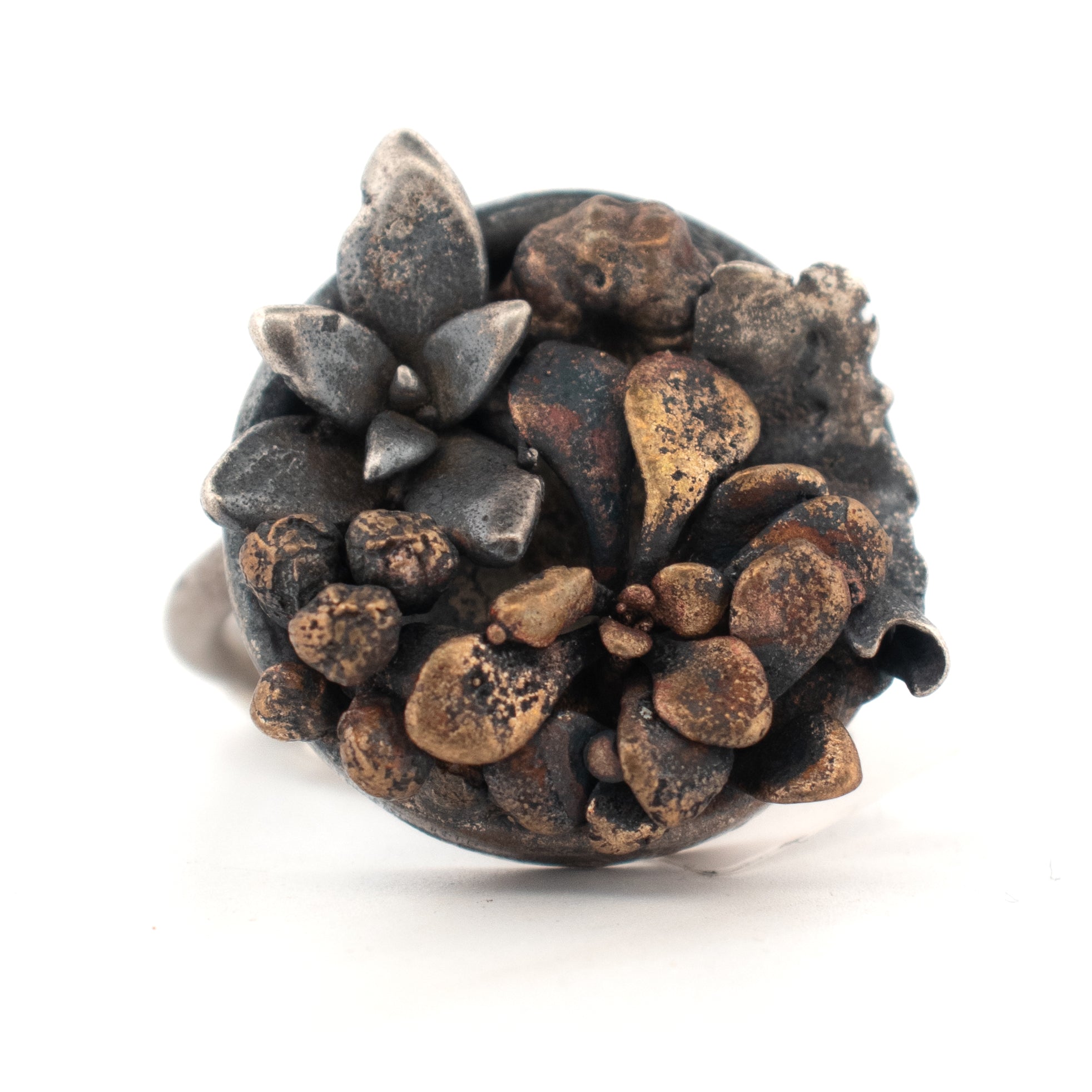 This sterling silver ring features cast pieces in sterling and bronze set into a sterling bezel and band. A garden you can't kill!